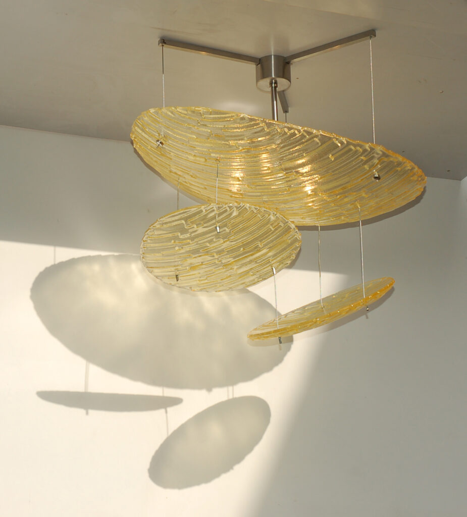 Ik (Sascha) werk voornamelijk in opdracht. Mijn toegepaste werk bestaat voornamelijk uit glas voor verlichtingsarmaturen van ons bedrijf Kunst & Licht. Dit zijn soms indrukwekkende lichtkunst installaties! Verder maak ik schalen, raampanelen, foto’s in glasherinneringsmonumenten, relatiegeschenken etc.